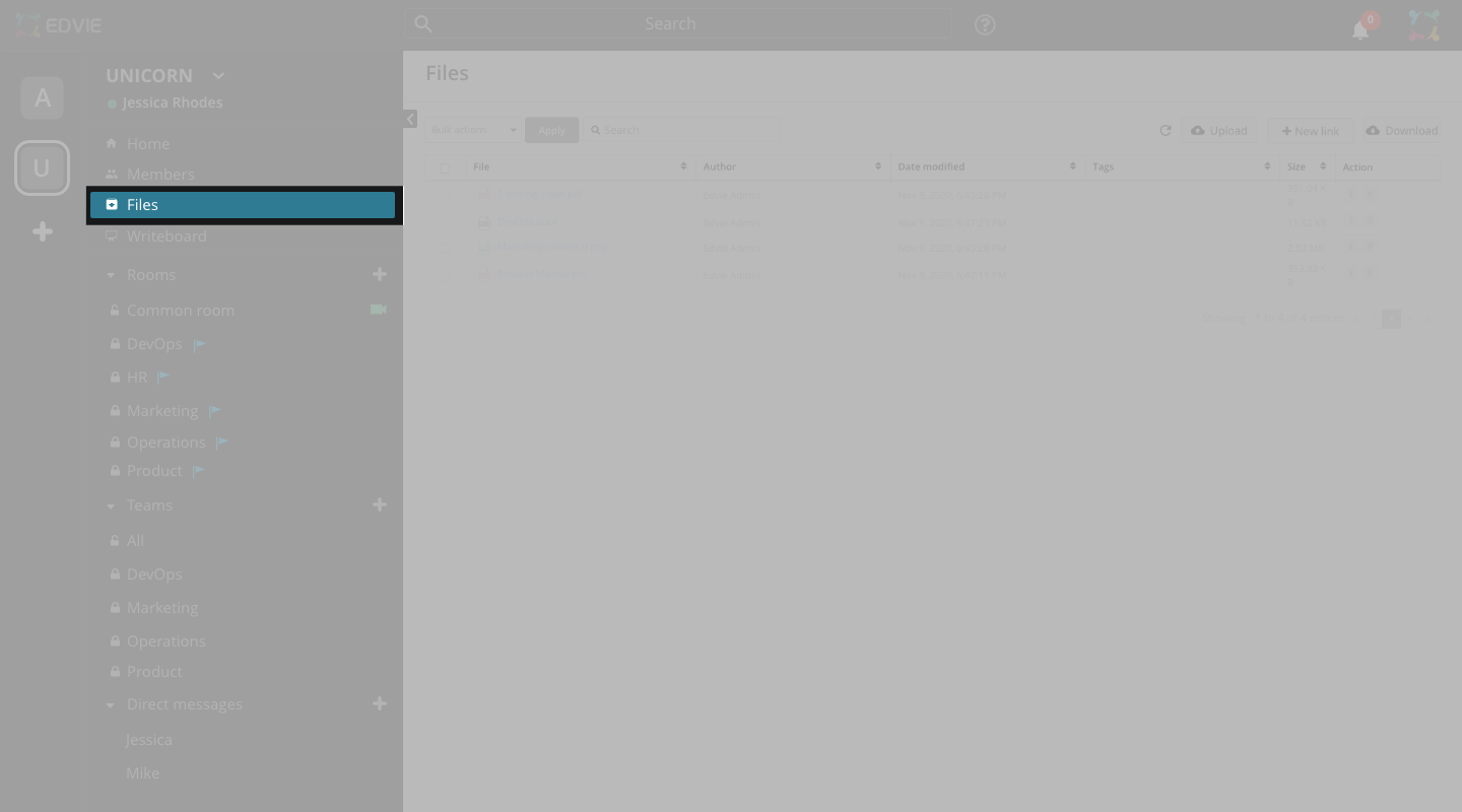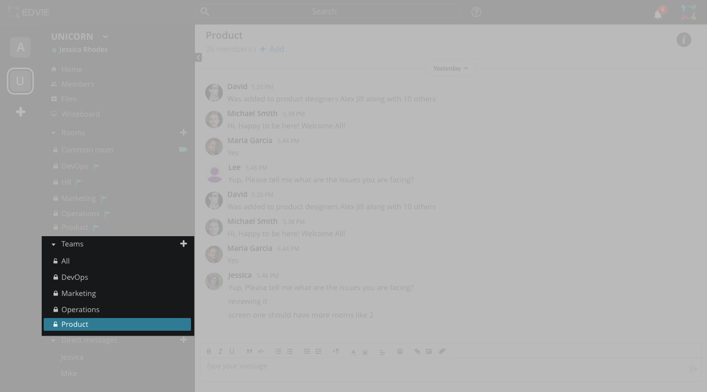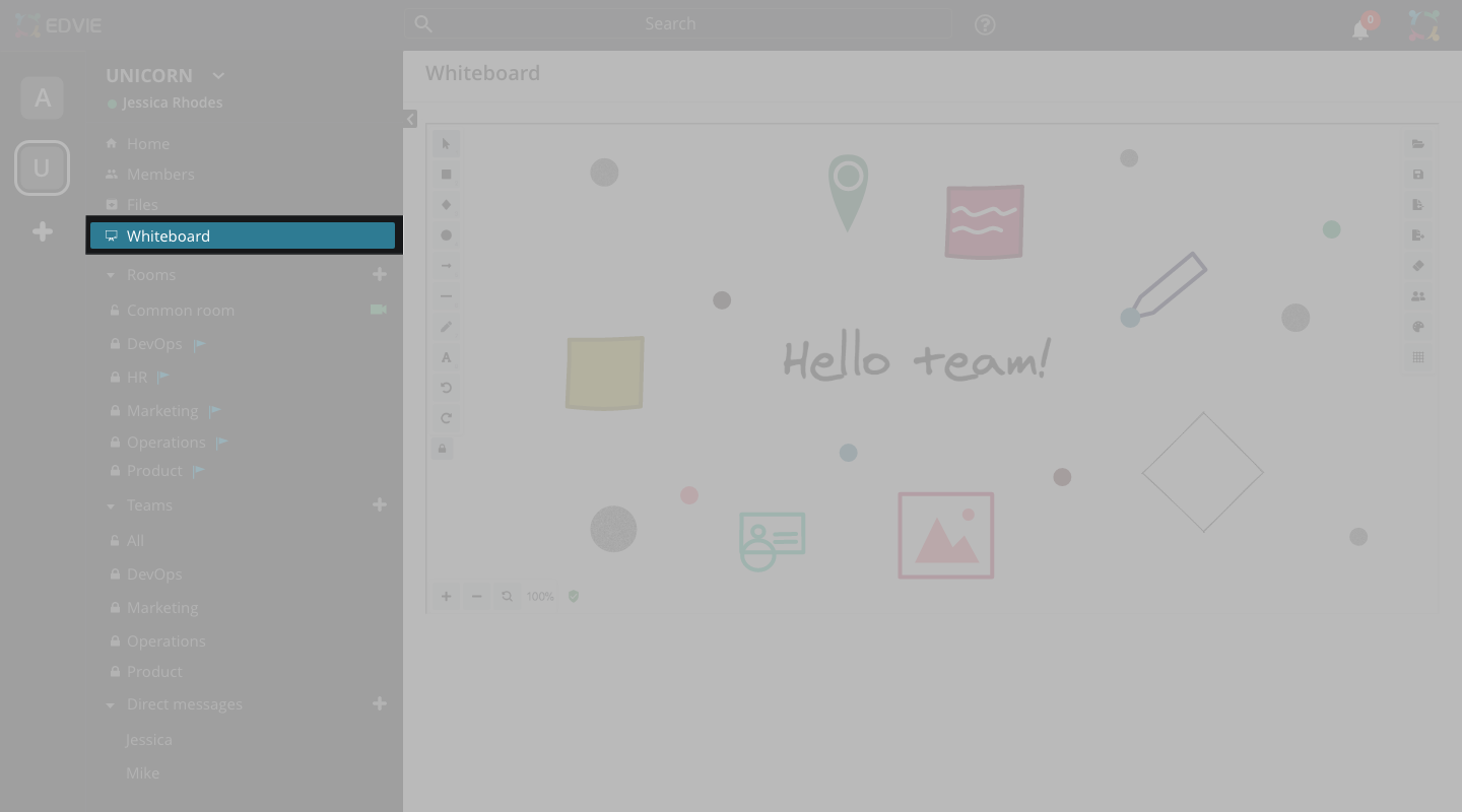 This is your navigation bar- you'll see about, files, members, whiteboard, rooms, teams, direct messages, and apps