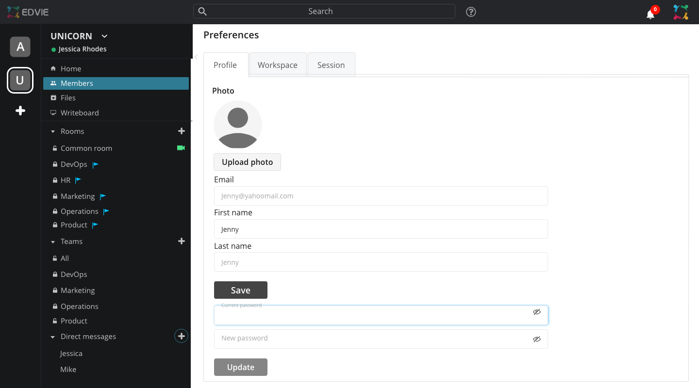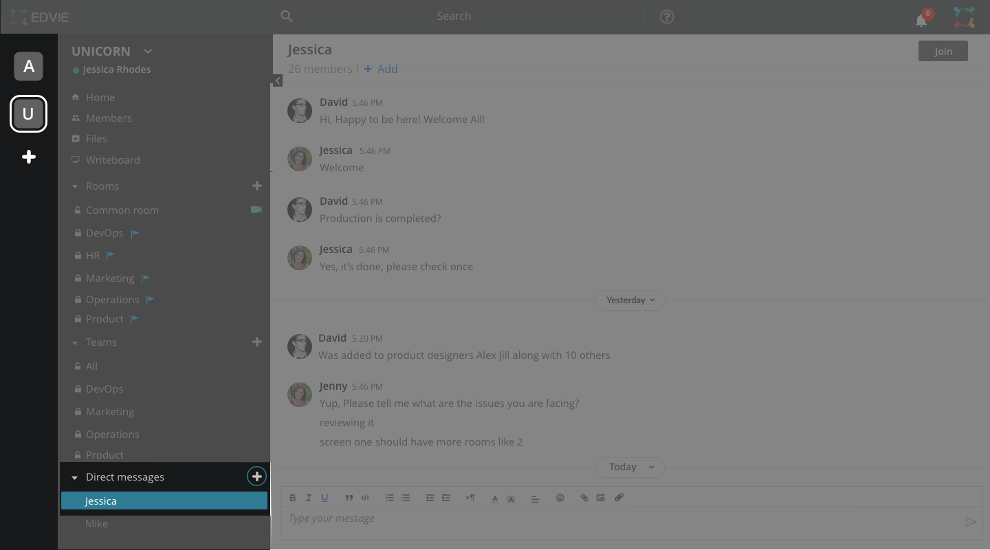 By clicking the (+) icon, you can create new workspaces and keep them organized by separating them and jumping back and forth between multiple workspaces. For example, a private workspace for sensitive HR-related communication, a workspace for administrative purposes, etc